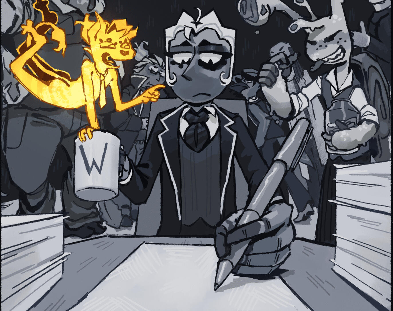 ⟡ WeeGerGai: My brother. Spell-checks my comic, tells everyone about it (as should you) and helps with organizing community events. He likes CDs too much.⟡ CyroWasTaken: My best friend. Fills-in the flat colors for my comic, keeps me accountable, and helps the community learn art for free! He likes rules and Dark Souls.⟡ Casual Supporters: Friedly fellows like Silly0Shark and crustyhobo are technically not directly part of company matters, but they're very active in "The Fishy Speakeasy" and help keep it healthy! Always there to give feedback when I ask.Thank you to you all!